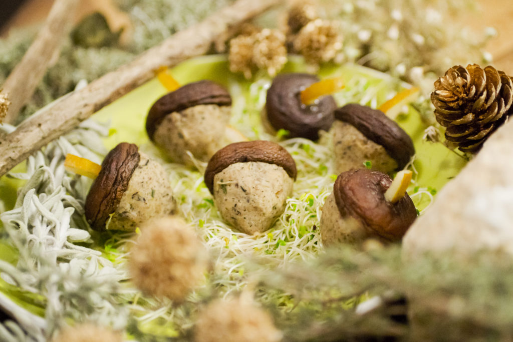 Des Blinis traditionnels infusés au foin (blé & sarrasin) – Tartare d’algues crémeux – Verrines duo de légumes racines douces et fraîches – Bouchées du sous bois au verger (champignons – marrons – poire) – Truffes salées surprises aux noix (potimarron) – Pâté campagnard sans four (blé) – Verrine crémeuse Poire-Amande & crumble amande & sarrasin (sans glu)
